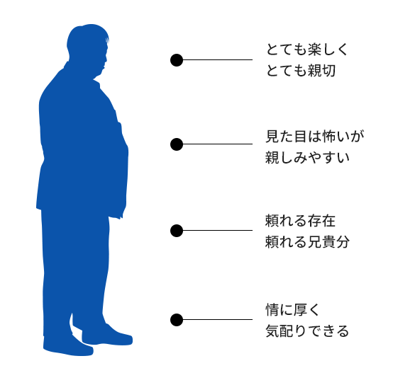 一見、見た目は怖い印象があるが、話しやすく、冗談やユーモアを交えるので親しみやすい。厳しいのは現場で怪我をしないというのが念頭にあるからこそ。厳しさの中に愛情がある方です。
